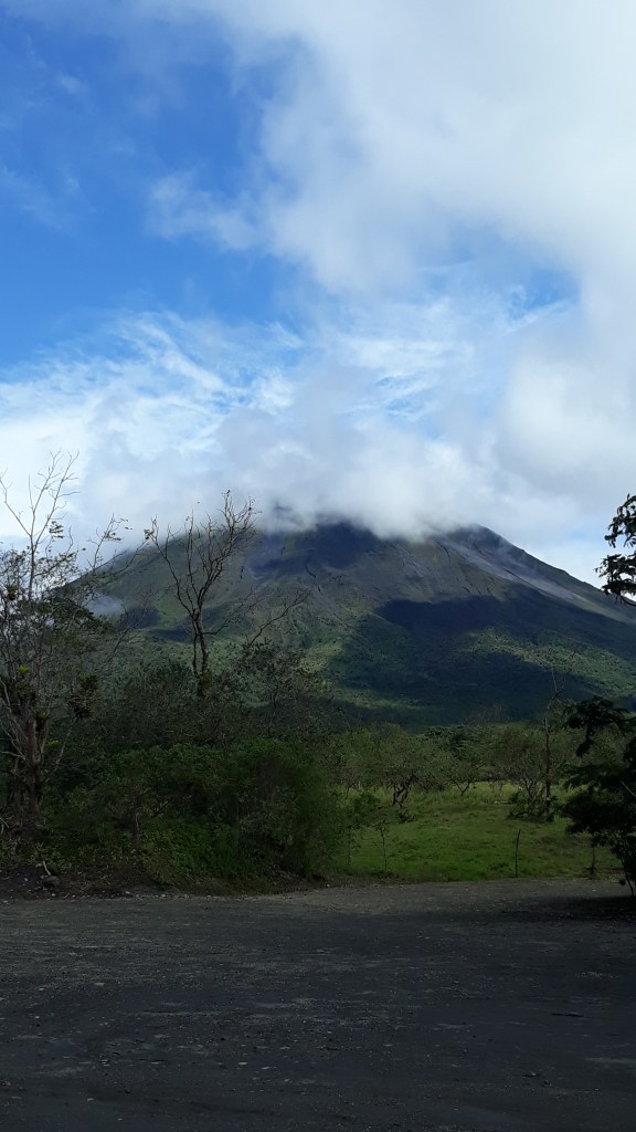 After rain on Monday and Tuesday, barely a drizzle yesterday and – Sun today! And a pretty good view of Volcan Arenal from the Arenal 1968 private reserve. I’ll start with a photo of that. We were so excited to see it and it looked promising that the clouds surrounding the tip might clear off, but in fact it got cloudier. But first, a few photos of the volcano.