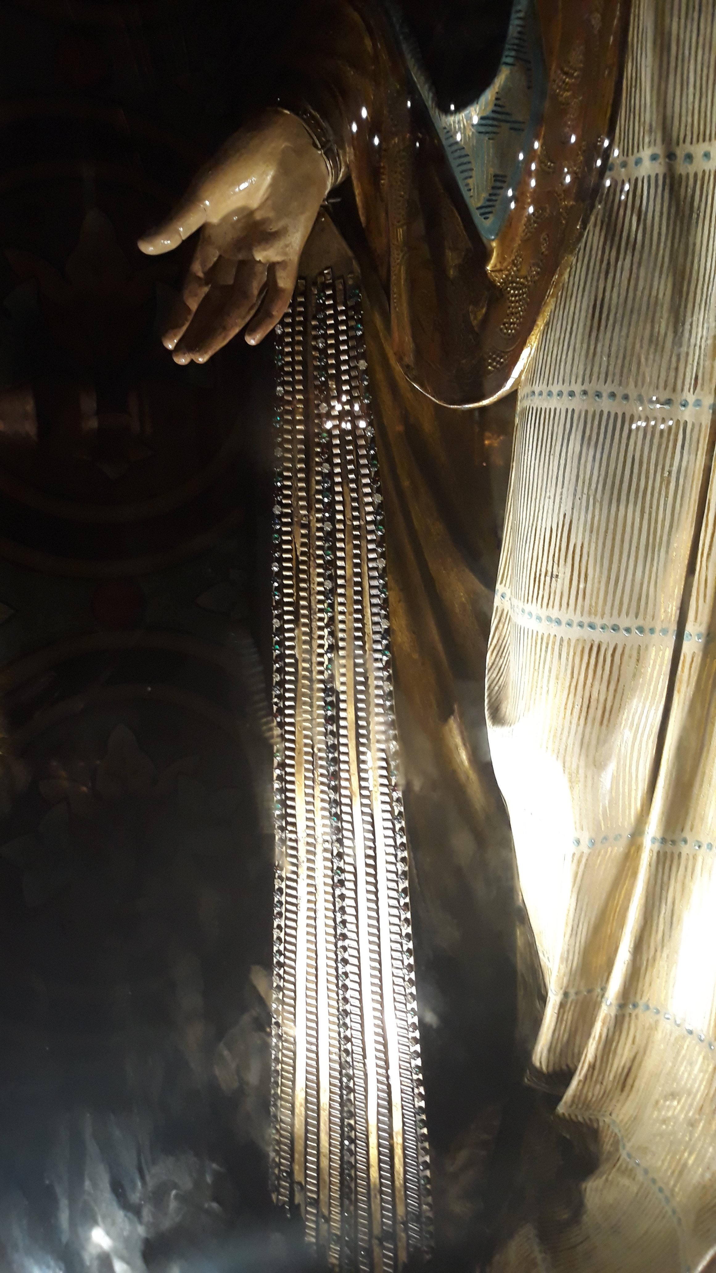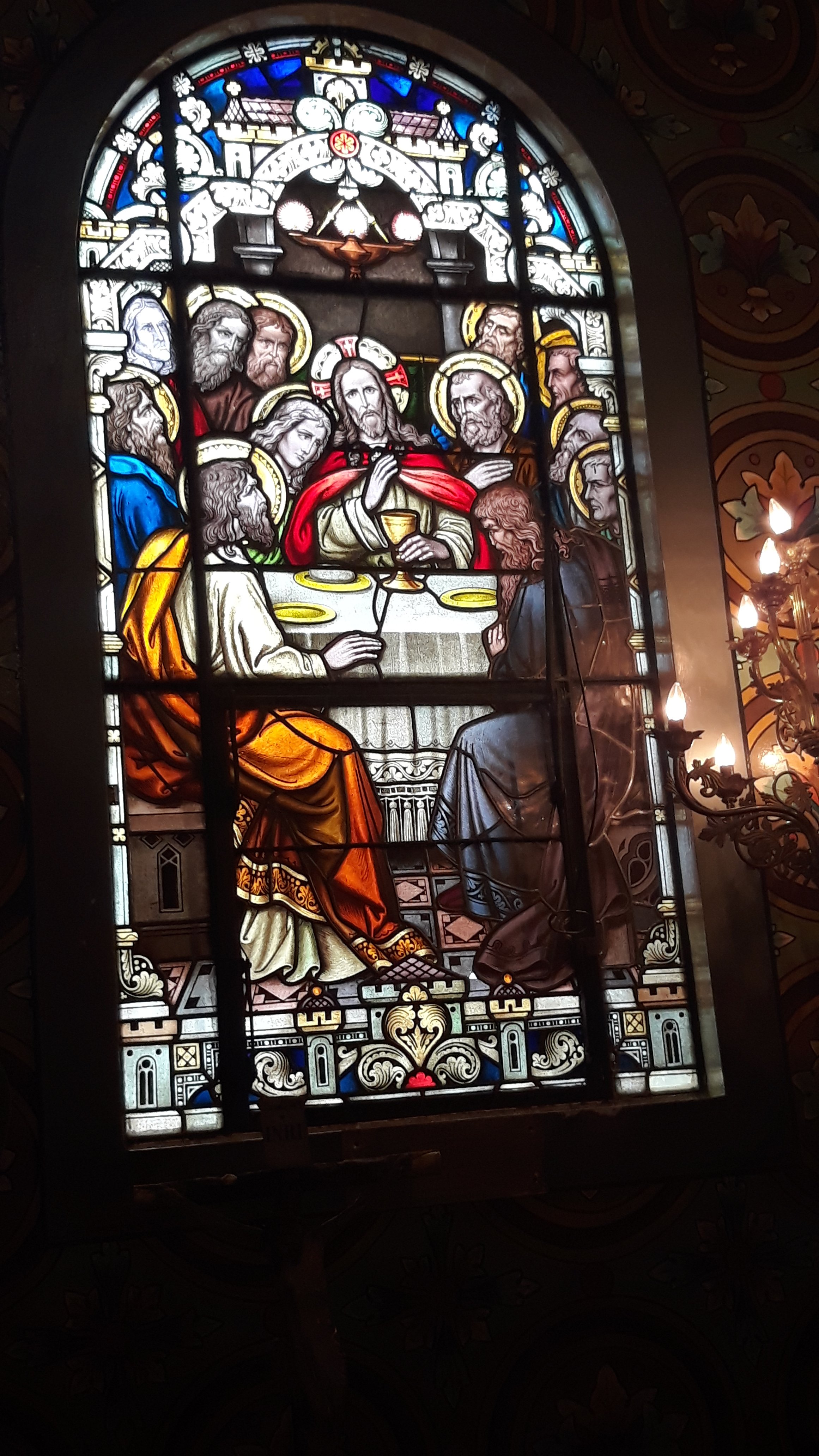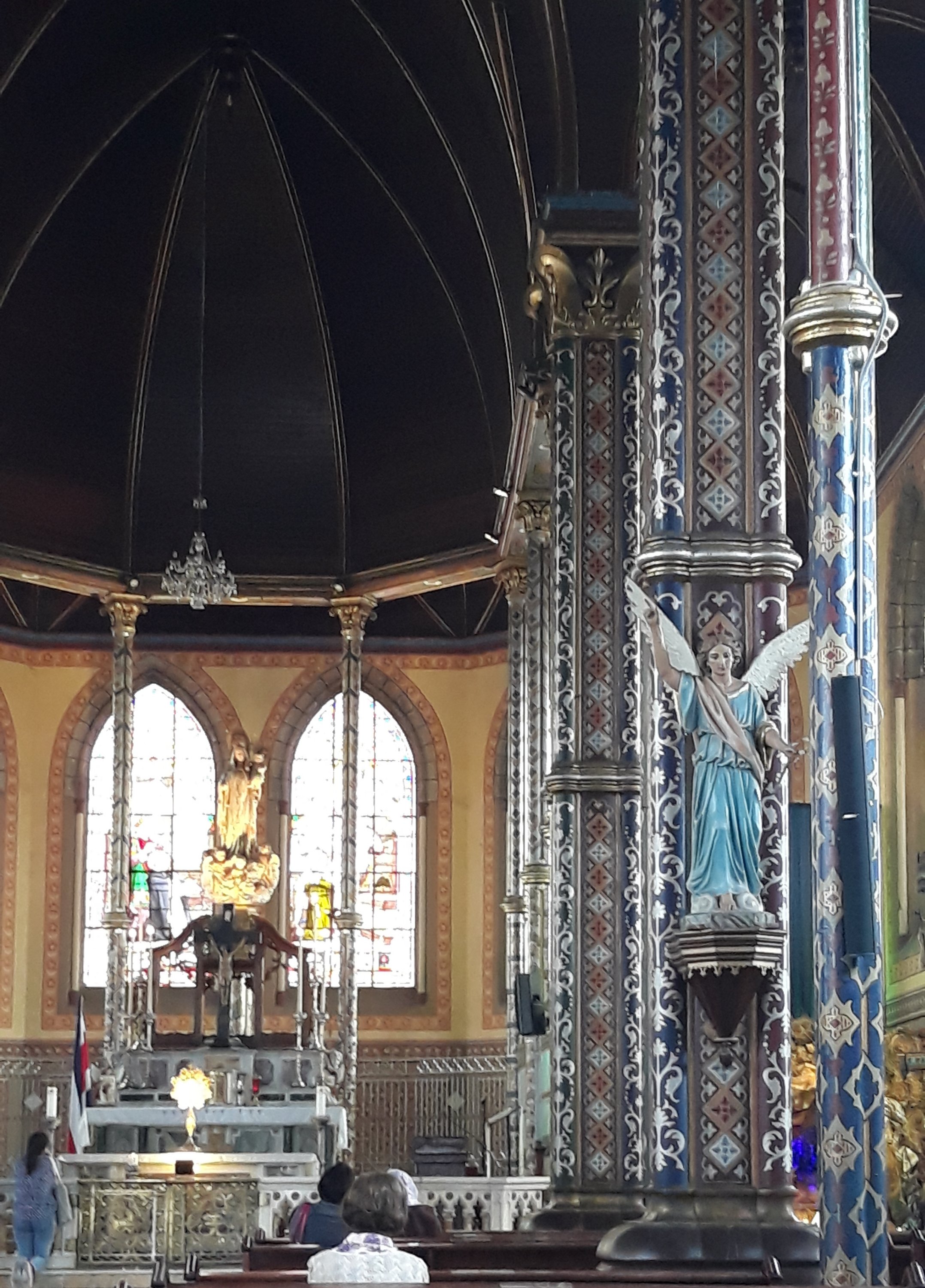 Getting here took a little time. Fortunately we have that. A 7 hour layover in Atlanta actually went by pretty quickly. The airport has lots of art to visit with, ponder, and appreciate. Lots of it was Haitian. Just an exhibition, we wondered or is there a direct flight to Haiti? We also walked quite a bit as it is a large airport. We stopped at a round bar for a beer. A couple of military guys sat and we heard the sorry saga of delayed flight, flight turned back, and more delays. They had actually flown Atlanta to Texas and then had to return.I have come to appreciate Delta as an airline. Long time since I’ve flown them. The Airbus 321 has comfortable seats and pretty good leg room. Also good snack selection. We did not pay extra to have seats assigned in advance. And it worked out fine and even especially well for the Atlanta-San Jose leg as we were assigned seats in the emergency row which always has great leg room. Plus! Movies on the seatback of the seat in front. No free beer or wine though on this international flight. I guess it’s too close.Oh, here is a photo from the Atlanta airport.I thought it tender and clever to find a way to pray in private.We arrived to our guest house after 10 pm, by which time the train that I had read about being noisy, was no longer running. Unfortunately, a local nightclub took over for the noise pollution. And while I thought sleep would take me quickly, as we were up at 4:45 after going to bed at midnight, no such luck. The incessant pounding of a barely existent beat (do I sound like my parents?!) kept me awake for awhile.It’s much cooler here, at least today, than anticipated. The variably overcast sky and a near constant breeze kept us comfortable – and even a bit chilly toward late afternoon and into the evening.We visited a couple of churches. I appreciate the wide variety of architectural styles and the unique touches that each church community brings to their place of worship. They are also quiet refuges from city hubbub. Taking a moment to sit quietly with thoughts of others and of gratitude provide a peaceful break. Here are a few of Iglesia Nuestra Senora la Merced.Above from door panelsThis head covering took me back to my childhood. It was forbidden for females to ener the Catholic church without a head covering. I rremember having to dash into the drug store across the street to purchase a “doily” last minute when I’d forgotten.This image of The Last Supper from Iglesia Soledad gave me pause. Is the “ghosted” figure on the left meant to portray Judas?Here are Mary’s hands with the very best blingy bracelets ever. Well, best looking whilst giving blessings. Which is about all you can do while wearing them.Here are a few images from Parque Espana. The little boy and his siblings were having a blast with this sculture.I found this enchanting scene in the park to be worth gazing into; so much to see. Just a gem, with a table and bench just there for a relaxing chat with friends or for solo relfection.San Jose is not a particularly attractive or historic or quaint city. There are few buildings of architectural interest asides from the churches – the post office and the Teatro Nacional, being the most prominent. The lore behind the Teatro Nacional is that a renowned opera singer on tour bypassed San Jose as it lacked a suitable venue. The city political fathers and business barons got together to put up the money to create one. It is the smallest of its kind that I have seen, though with all the requisite features that one expects – guilding, marble, velvet, murals mirrors, sculpture – the whole gamut. Unfortunately, there are no espectaculares scheduled while we are here.An unusual feature of this theatre is that the seats orchestra level can be removed. The floating floor can be raised to the level of the stage to create one large space for balls or other gatherings.Later in the afternoon, after a repast of comida tipica at the Mercado Central, I mentioned to Charlie that I’d read that craft beer was available of late in San Jose and that we’d have to do a search. A moment later, we turned a corner and Lo! I saw a sign. Pub Piso 3. Up to the 3rd floor we bounded to find a comfortable space with a table by an open window overlooking the peatonal – and a decent IPA!Here is a simple way to make a chandelier:The peatonal with the Post Office in the background:And finally, I’ll leave you with this:I sure wish that I had been taking photos of bathrooms and bathroom doors more assiduously throughout my travels. I think it would make a terrific bathroom book. Don’t steal my idea!Good night.