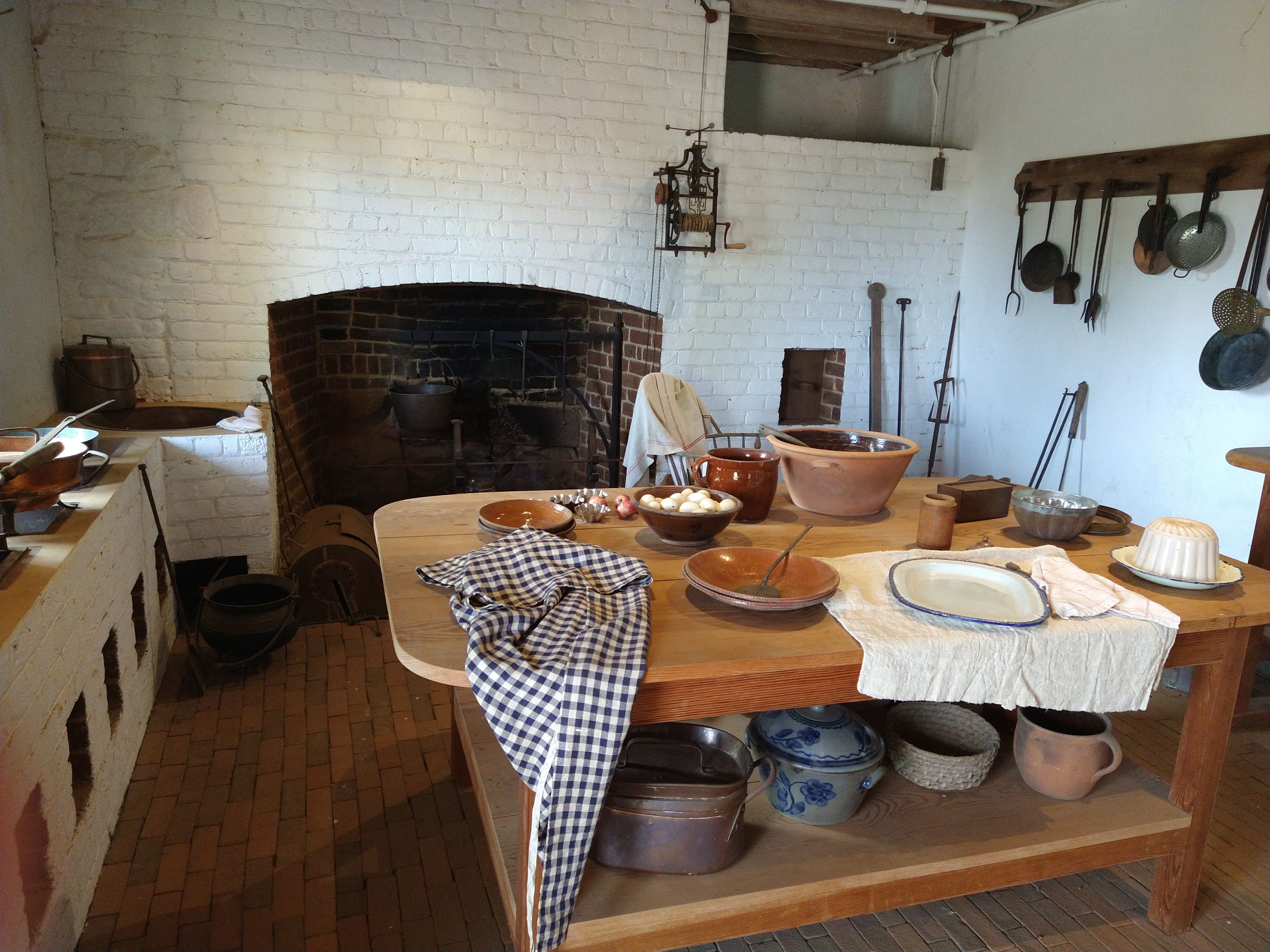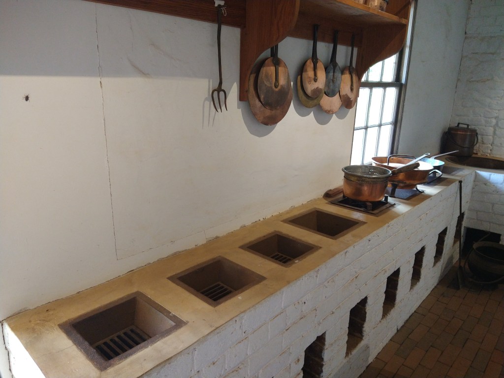 Typical hand-built home, 1700s – those were some rugged, self-sufficient folk. To the left of the house is the meat (mostly pork) storage barn and root cellar. Stairs lead to a small spring shelter. Running water kept dairy, eggs, and other perishables fresh.