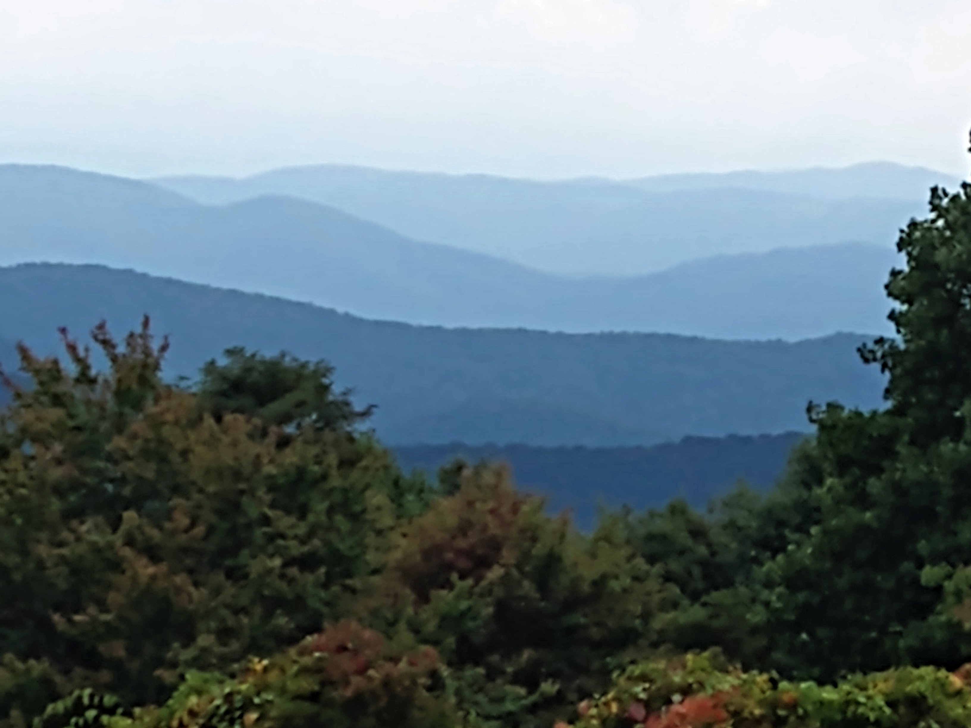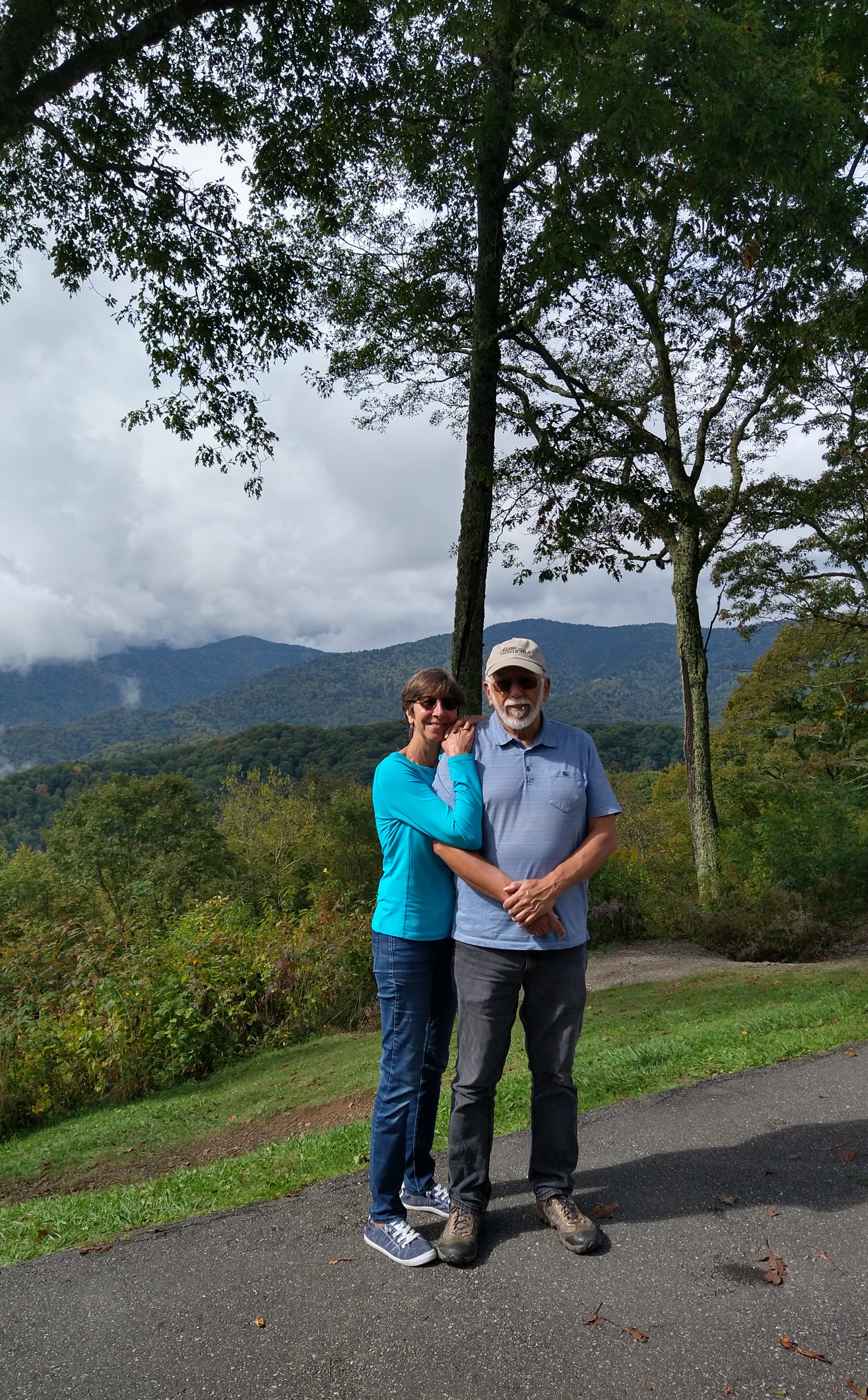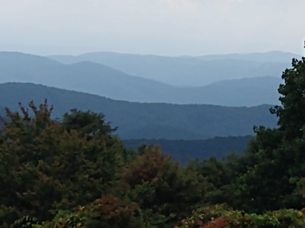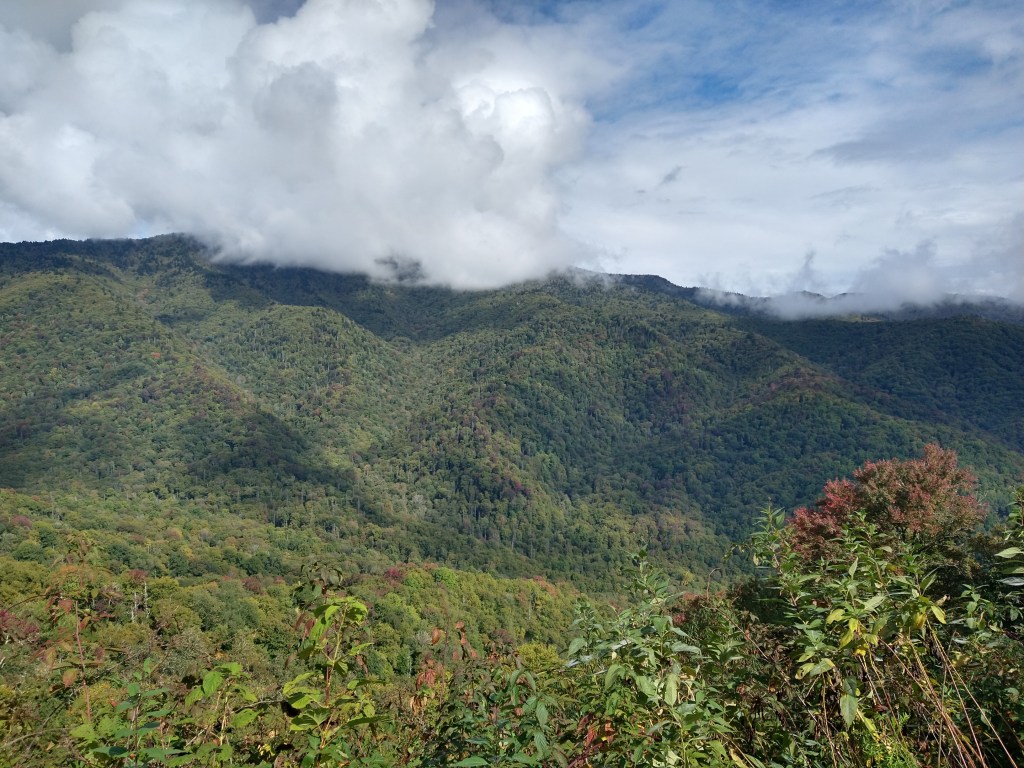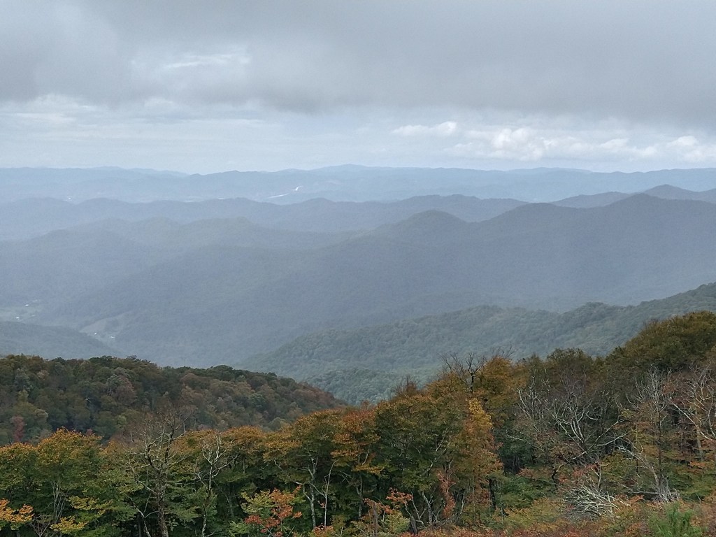 This photo and the next go together.Behind us, somewhere behind the clouds is Clubman’s Dome. That’s where I started my Appalachian Trail trek. Julie and i walked it south, 100 miles to Helen GA. That was 40 years ago!Some color showing up …