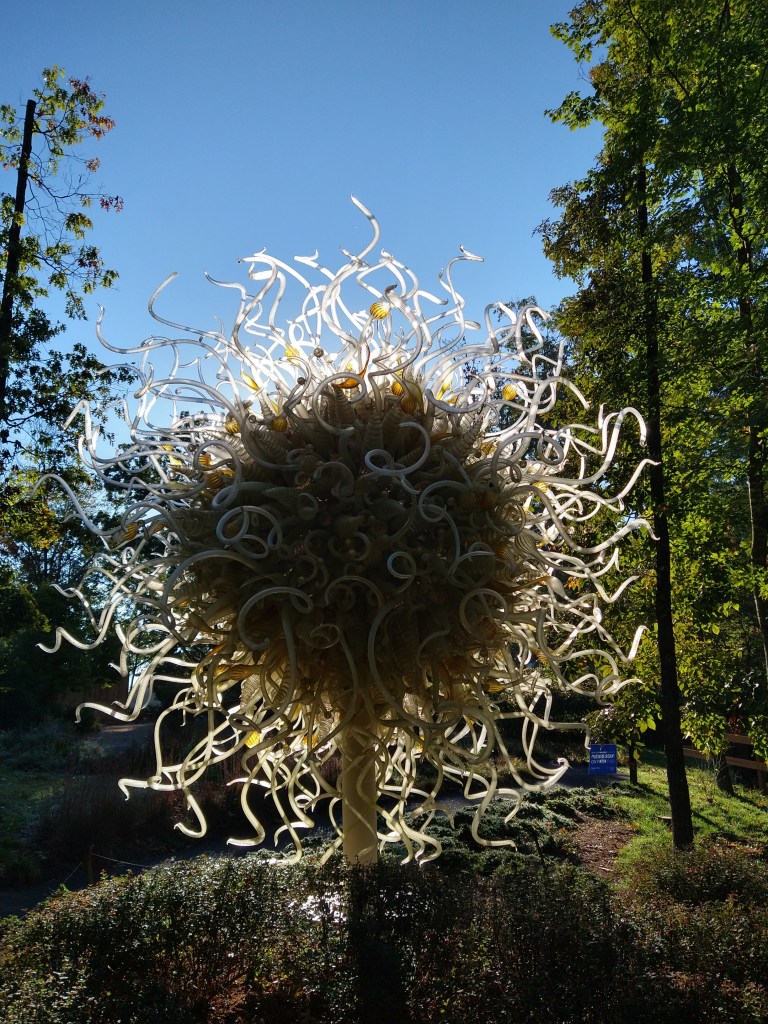 Chihuly. 1300 individual pieces of blown glass. 5000 pounds.The sun. Or a dandelion gone to seed. Or the back of a head of unruly hair…Not to scaleTo scaleHow I would love to see her sculpture made up if treader homes or aircraft parts! Why not old truck bodies?