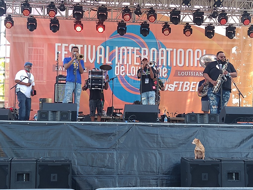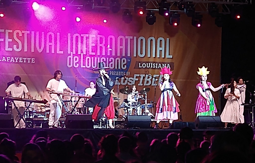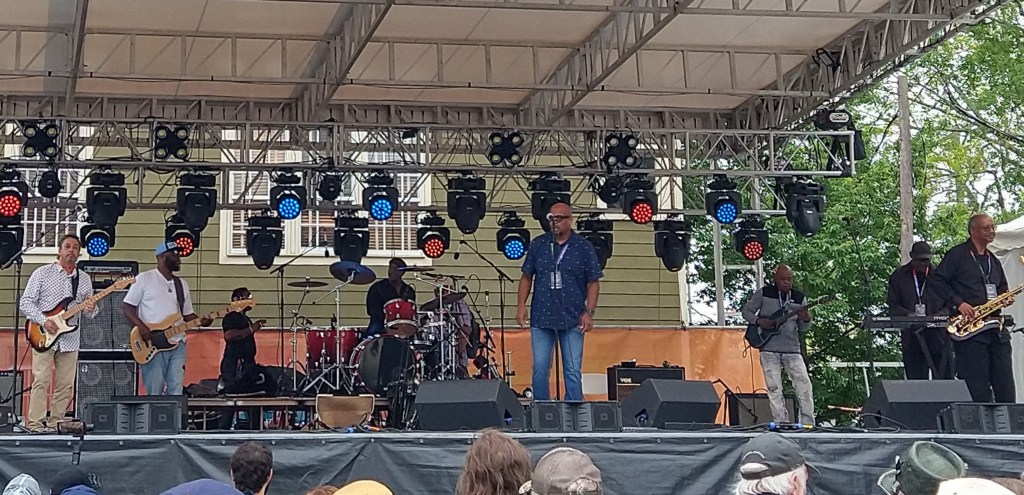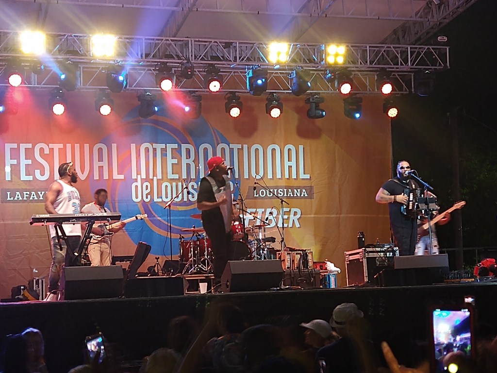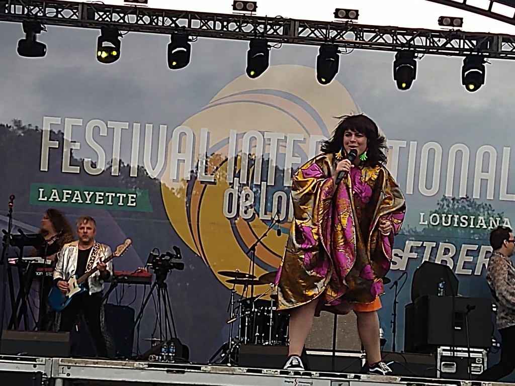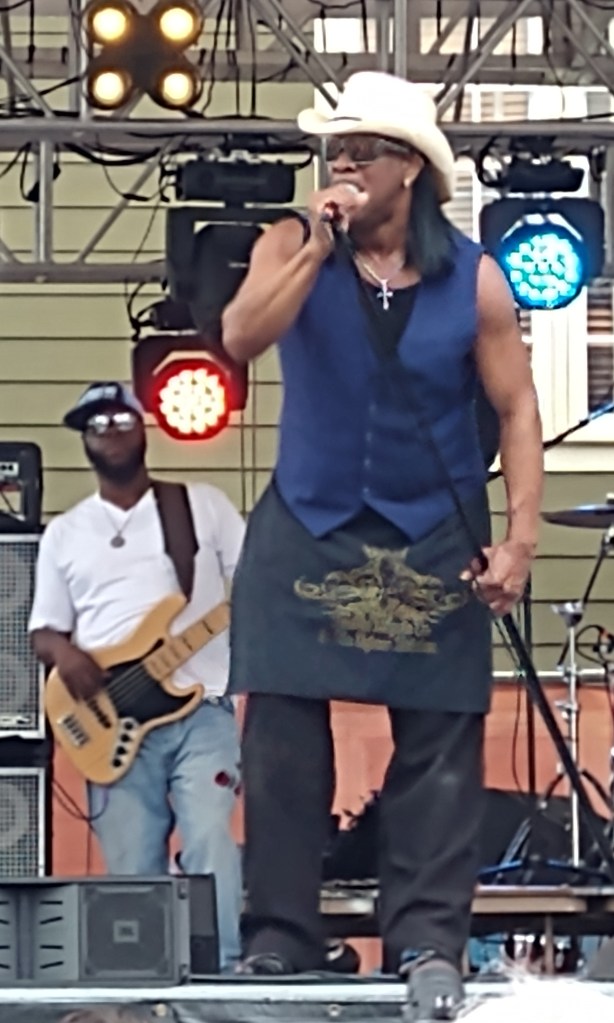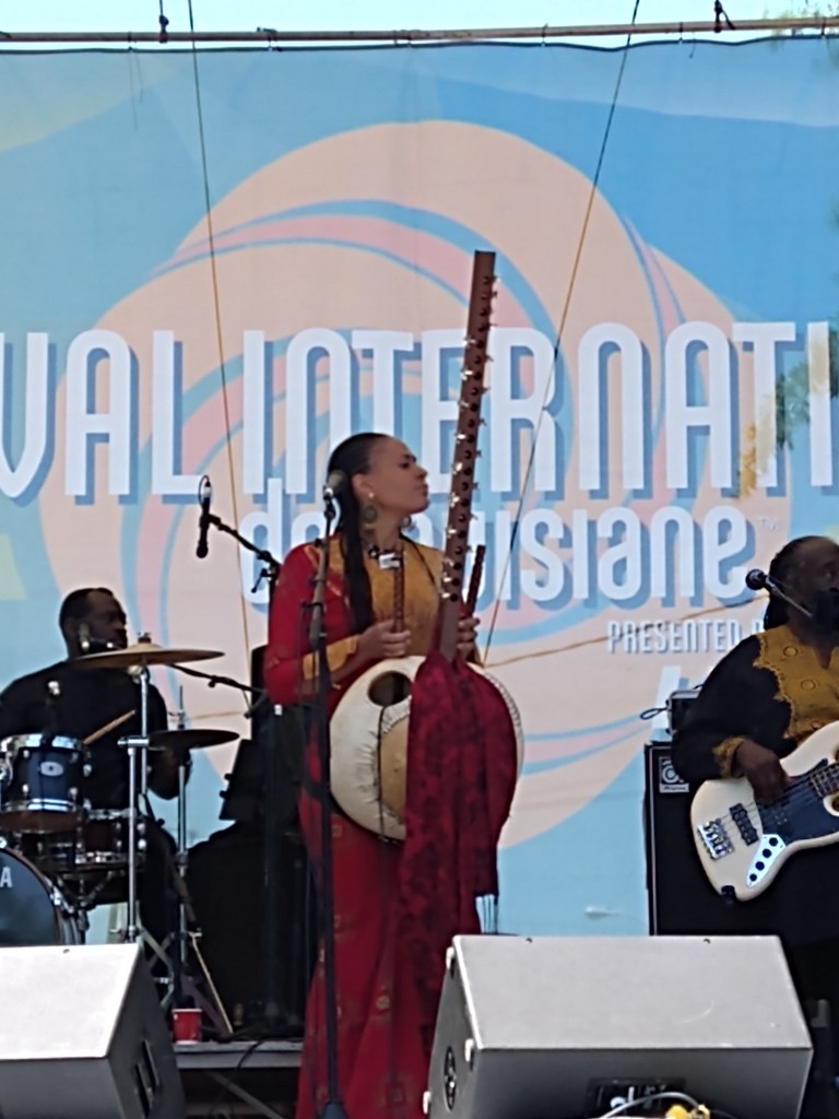 Today we awoke to gorgeous sunshine and a comforting breeze. Arrived at festival in time for Turvengen Band from Mongolia and the US. Again, the stringed instruments have a different twang and timbre, one guy sang in that guttural multi-tone that Mongolians do, and the drum set was not your usual. Plus the drummer also played a horn that had a sound akin to a dgiereedo (sp). We stayed for several songs, but then wanted to get over to another stage to hear Karma and the Killjoys. They rather killed my joy. We didn’t stay long. We heard them on youtube doing a Tiny Desk Concert and they sounded interesting. Live, however, their singing and playing didn’t stand up. So off we went to hear Cedric Watson & Bijou Creole. Their playing was solid and Cedric plays a sharp little accordion.