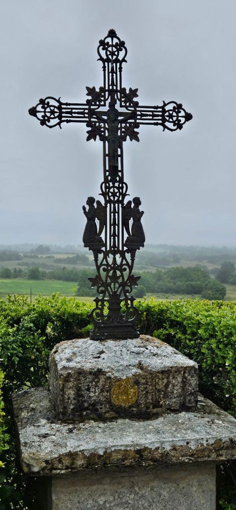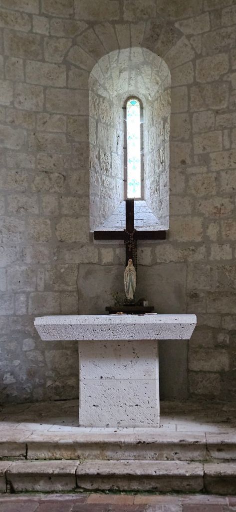 Another dove cote, in France, c’est un pigeonnier. Pilgrims might have found this offering of water.I rang the bell.Inside – very plainWe’ve been witnessing some very dramatic skies. It’s much cooler than usual here, which works in our favor. It’s been very comfortable waking weather. Only two rainy days so far, not too hard, not windy. Quite nice, really.