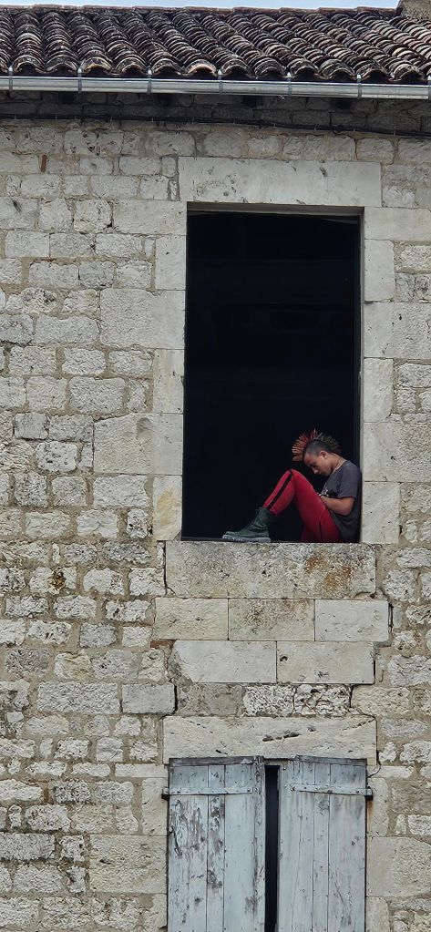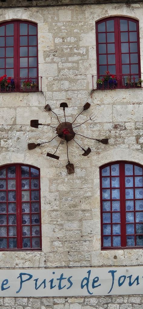 Mohawk boy in medieval building Central squareTools as sculpture. I first thought it was a clock!Medieval charmLauzerte left behind, as we headed for our Gîte, La Ferme Parry, about another 4 miles out of Lauzerte. That made a 15 or so mile day.