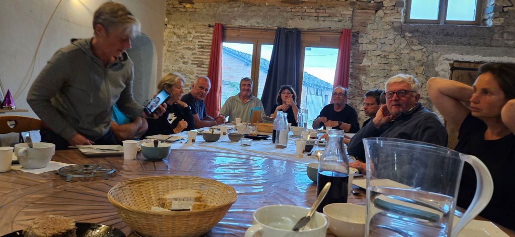 Yesterday, the 4th June, we walked Auvillar to Miradoux. We arrived early and so had a beer ( okay, 2, but they were each half pints), bread, and cheese while waiting for our Gîte. Laurance joined us for a bit and I got to parler français with her. It was a good warm-up for the evening with our hosts. We were their only guests and so I had quite the time – three hours of listening to and responding to French. We covered all kinds of topics and I really enjoyed it! When we are at a Gîte with lots of French speakers, it’s too hard.