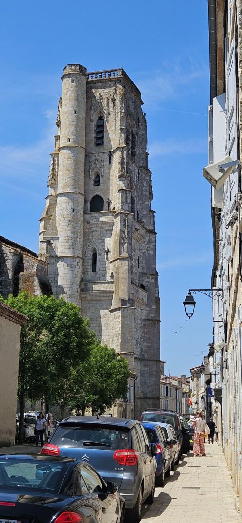 We are now sitting outside the Cathedral and Abbaye St. Pierre. It’s massive with a beautiful cloister area, each of the 76 capitals atop the columns has a unique decoration. More than half depict episodes from the Bible (Samson in the lion’s den) or saints. The others are decorative – palm leaves for instance.