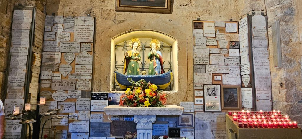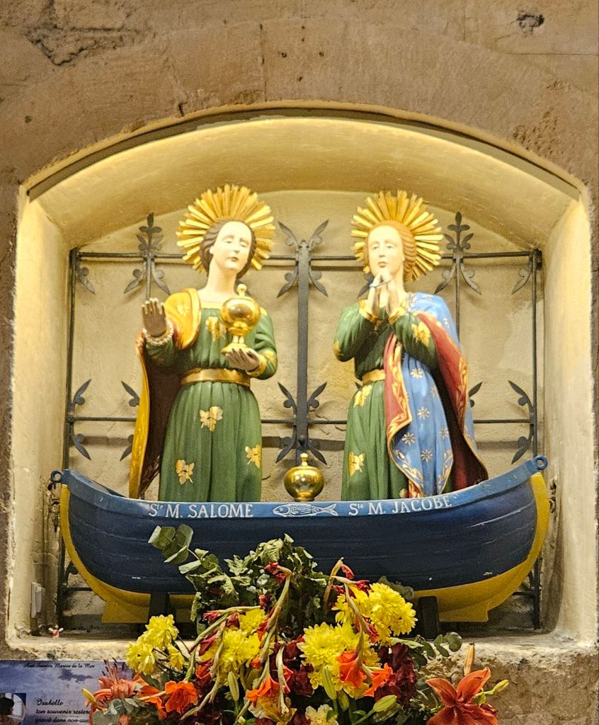 “Legend has it that Marie Jacobé, the aunt of Jesus, and Marie Salomé were washed upon the shores of Saintes-Maries-de-la-Mer when they arrived from Palestine in the first century AD, thus giving the town its name. When she heard that their children were being killed, Sara, their servant, vowed to protect the gypsies of Saintes-Maries-de-la-Mer and in consequence became their patron saint.” (from France This Way website)