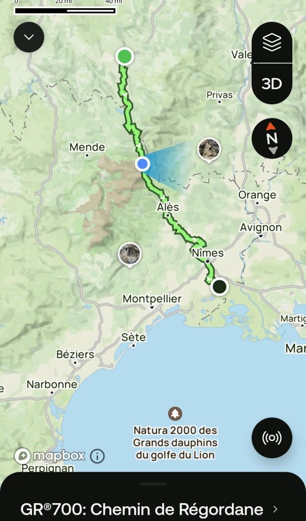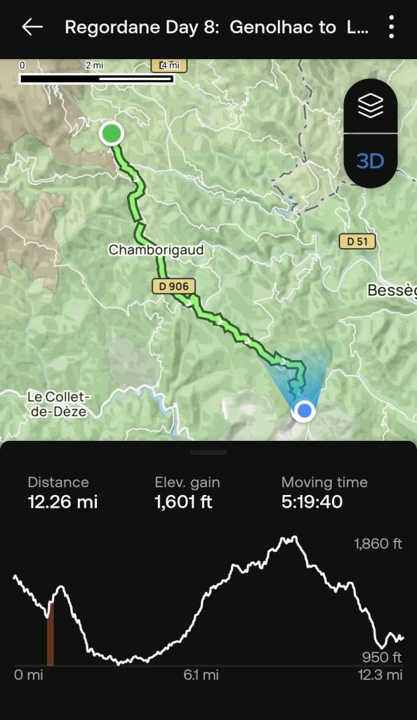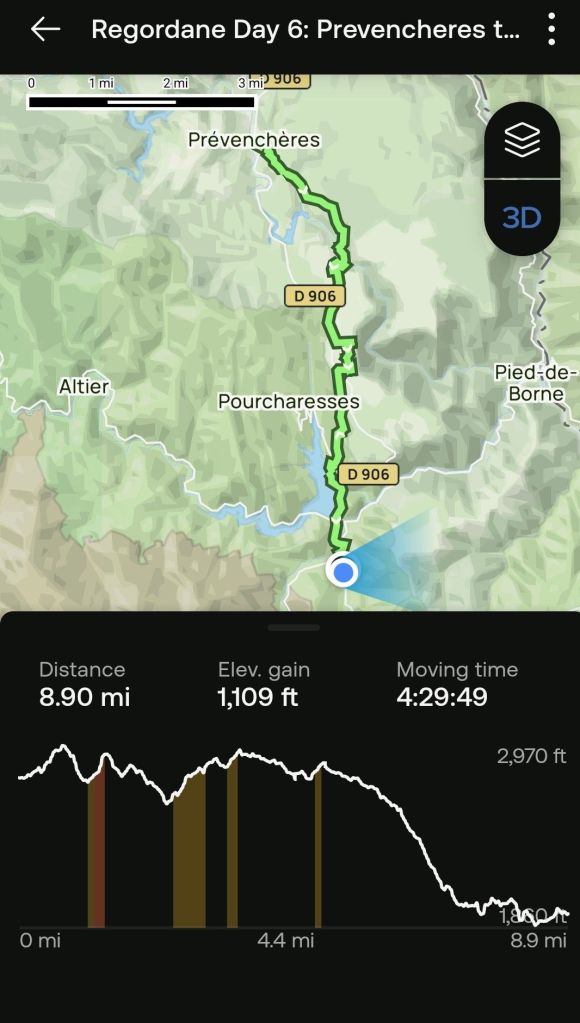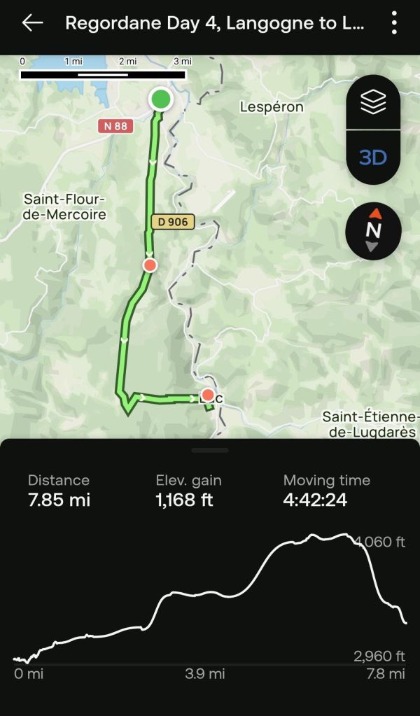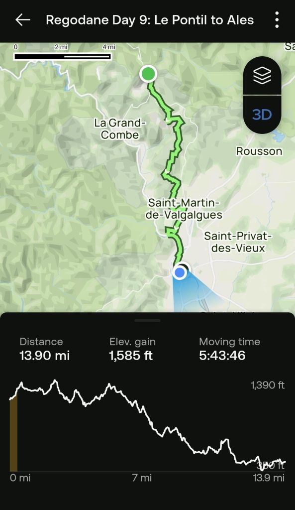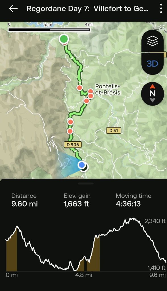In addition to misjudging the elevation profile, I also misjudged the accuracy of the AllTrails map. Apparently, since the Alltrail map was generated, the group that maintains the Grand Randanné has made significant changes to the GR700 as it approaches the Ales metropolitan area. While in the middle of a forest where the waymarking was a bit vague, I trusted the AllTrails map guide to resolve an inconsistency and we ended up in an area where the we were separated from the trail by a fence, and there were no waymarkings to follow. Fortunately, there are plenty of trails that can be located on Google Maps, so we eventually found ourselves and the official trail. I guess it is adventures like this that keep us traveling.