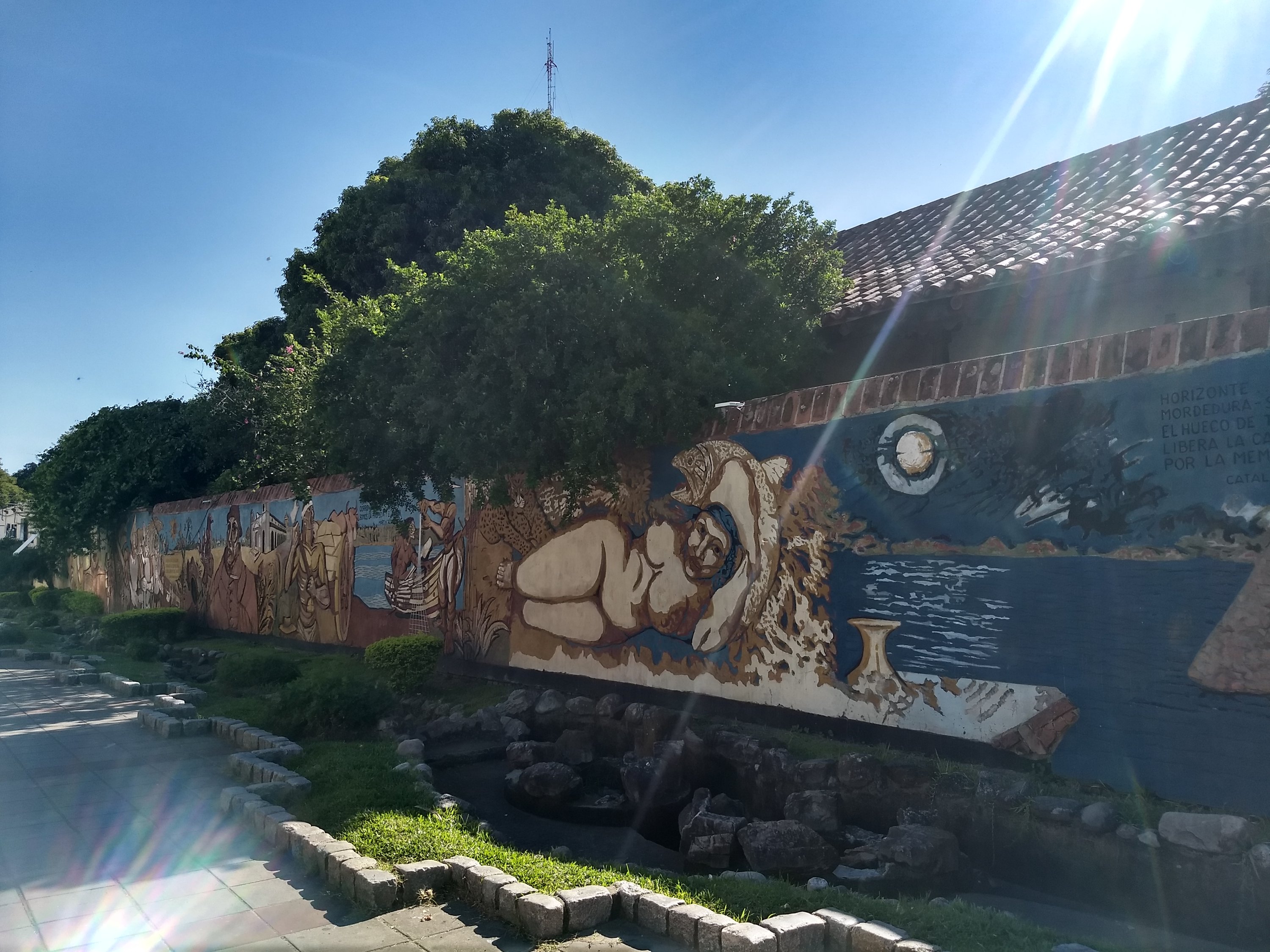 An upstairs gallery had a bas relief mural covering four walls, representing the history of Costa Rica, from pre-columbian days , the colonization by Spain, and the emergence of the modern era. The room was brightly lit by the many windows, so it was difficult to capture all of the mural.