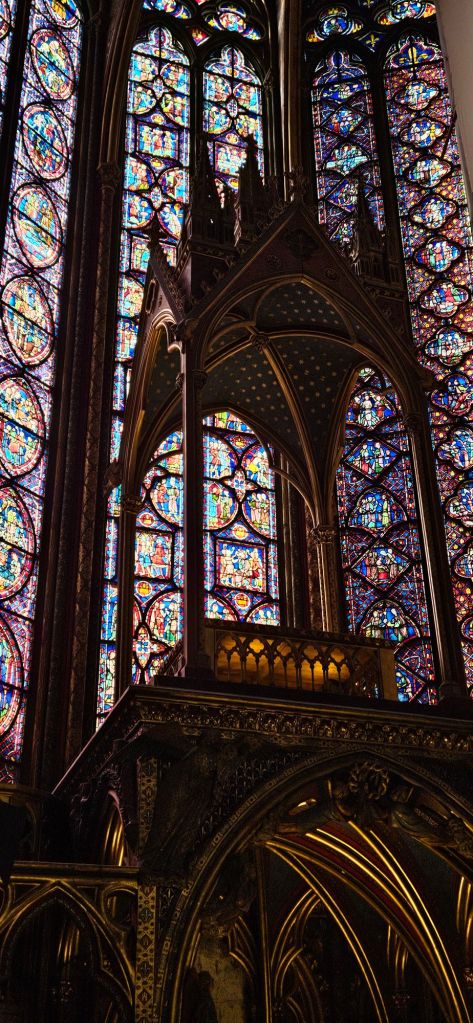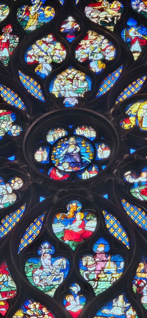 Close-up of the Rose window – theme, the Apocalypse.This Rose window, 1485, replaced a more primitive one of the 13thC3 walls hold 15 of these 15m tall windows which tell 1113 stories from the Bible, old and new testaments. I’ll wager that people in that time were literate regarding the images.